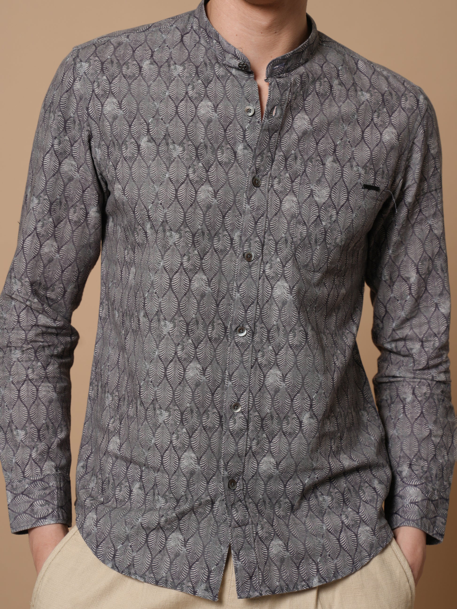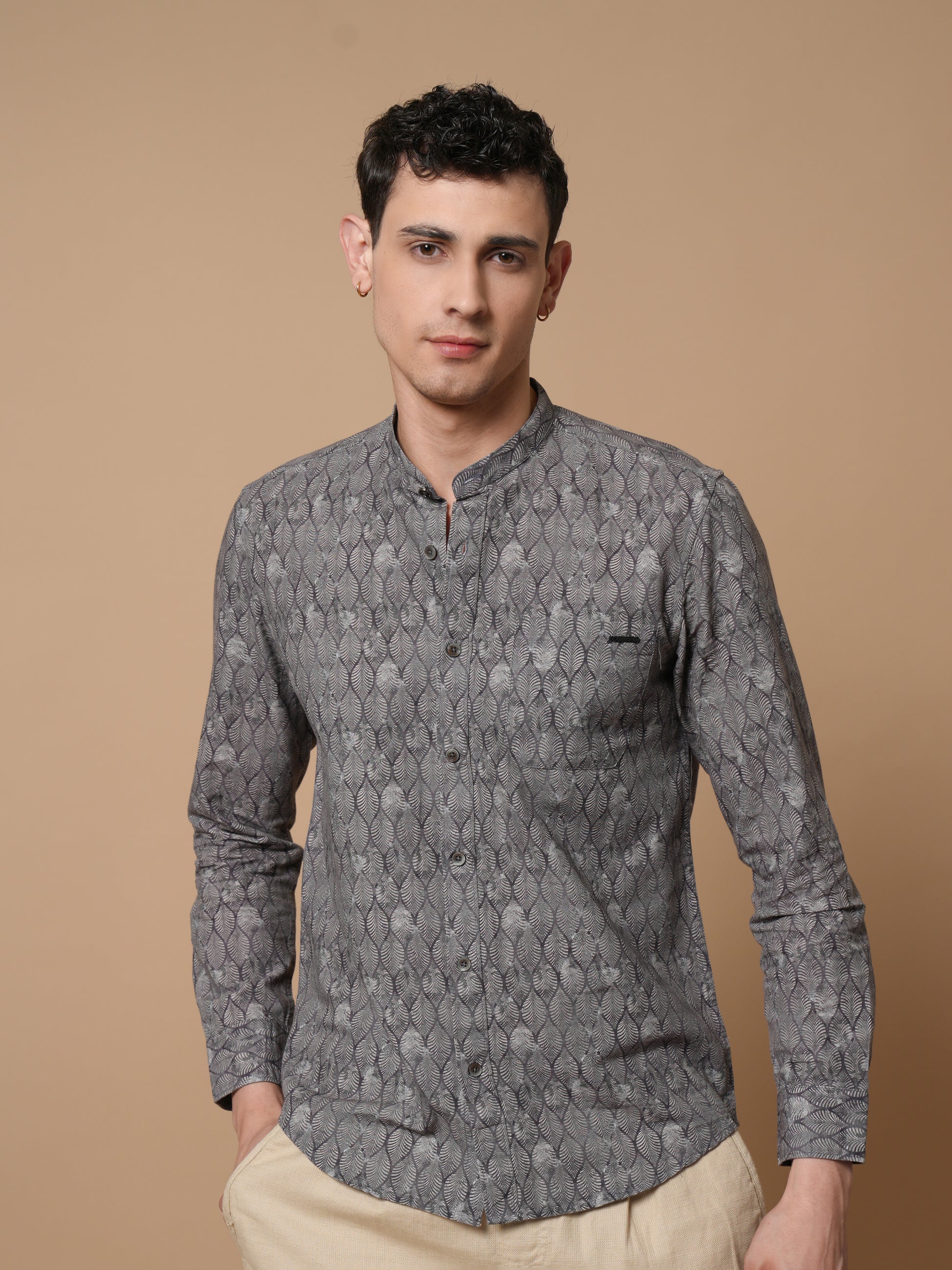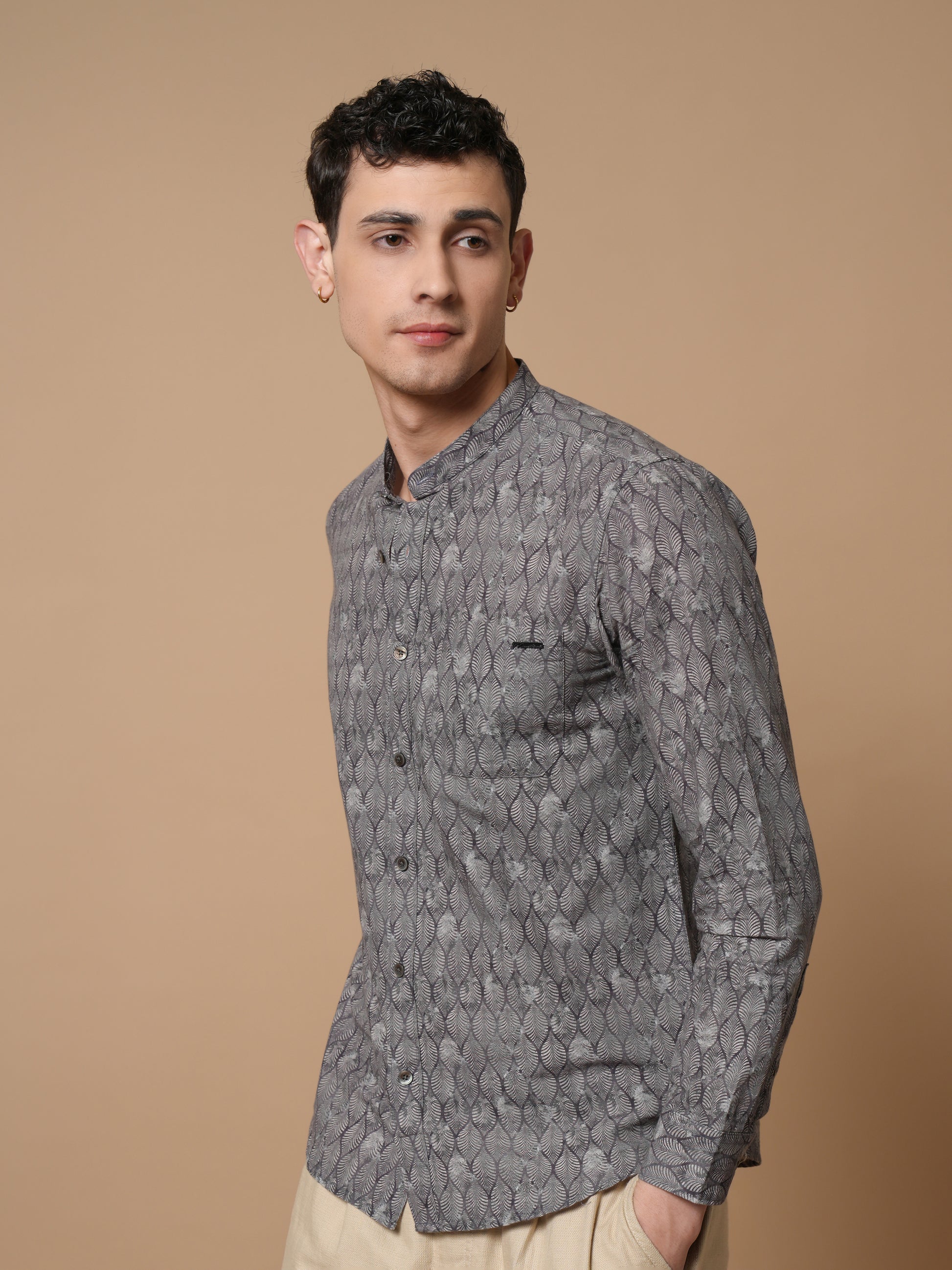 Men’s Grey Printed Mandarin Collar Casual Shirt